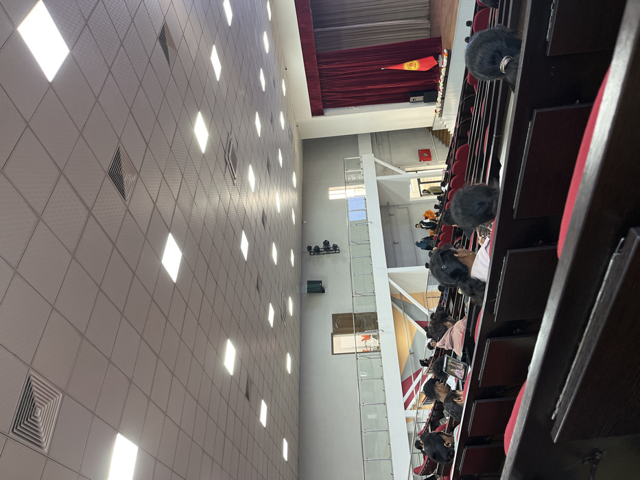 - "The image depicts the interior of a large auditorium or lecture hall, identified by the presence of the Kyrgyzstan flag on the stage, located in Bishkek City, Kyrgyzstan" by FM-Z8yW53, licensed under CC BY 4.0