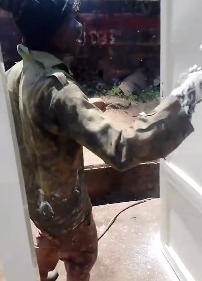 A person in a camo jacket, brown pants, and a black hat is spray-painting a white door frame and door outside