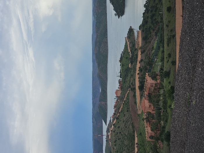 The image presents an elevated panoramic view of a landscape in Oumazza, Morocco, featuring a large body of water surrounded by undulating terrain. The foreground consists of a dark, coarse gravel or rocky surface. In the midground, a substantial, multi-story building complex with terracotta-colored facades and roofs, displaying fortress-like architectural elements including crenellations, is situated amidst green vegetation and numerous palm trees. Adjacent to this complex, a winding dirt path or road is discernible, along with a long, light brown retaining wall that follows the contours of the hillside towards the water. The landscape includes terraced hillsides and scattered patches of green and brown vegetation. The central feature of the scene is a vast, calm body of water, likely a reservoir or lake, which extends through the middle and background, curving between several green and arid hills. On a distant hill to the left, a tall, slender communications tower with alternating red and white bands is visible. Several smaller buildings with terracotta roofs are sparsely distributed on the hillsides nearer to the water. The sky is partially overcast, exhibiting a gradient from light grey to muted blue, with diffuse cloud cover. No individuals or specific actions are discernible within the frame.