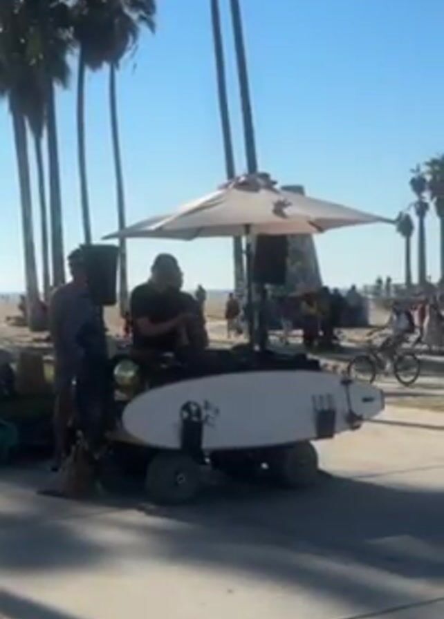 On a sunny day, two men are playing music on a portable DJ setup on the Venice Beach boardwalk. The setup, covered by a large umbrella, rests on a four-wheeled base, with a surfboard attached horizontally. Speakers flank the DJ station, and the area is surrounded by palm trees and pedestrians enjoying the beach. One man adjusts the equipment while the other stands beside him.