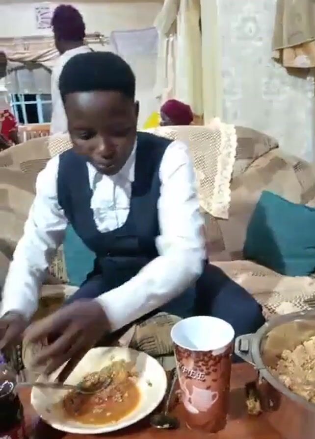 A young man is seated on a couch in a living room, dressed in a white shirt, black vest, and black pants. He is using a spoon to serve himself food from a large stainless steel pot onto a plate. The plate already has some food on it, covered in a brown sauce. Next to the plate is a tall mug with coffee beans printed on it. Other people are milling around in the background, some partially visible behind the couch. The room has patterned wallpaper and fabric furniture. There is a bottle on the table, and music can be heard.