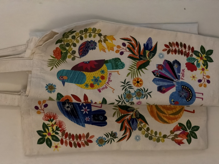 Two off-white canvas tote bags are hanging against a light-colored, plain wall. The bag on the right partially obscures the left bag. Both bags are adorned with colorful, stylized folk-art illustrations depicting various birds and intricate botanical motifs. On the rightmost bag, a teal-bodied bird with a yellow, flower-patterned chest is labeled "Wood pigeon" in red, vertically oriented text. A blue bird with a multi-colored fanned tail is labeled "Fantail" in blue text below the "Wood pigeon." Surrounding the birds are clusters of vibrant flowers, leaves, and berries in a palette including blues, greens, reds, yellows, and oranges. No features within the image enable determination of a specific location in Sofia, Bulgaria.