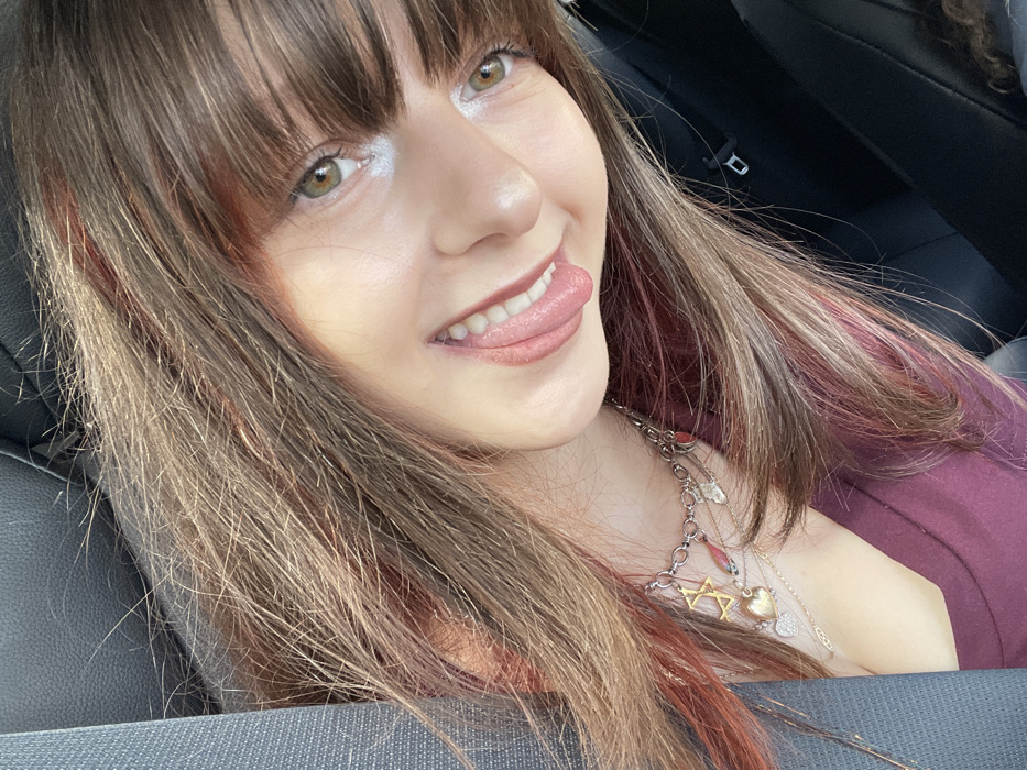 A close-up, angled selfie-style photograph depicts a young individual, likely female, inside what appears to be a vehicle. The subject has long, brown hair with distinct reddish-pink highlights or streaks, styled with bangs across the forehead. They possess light-colored, possibly green or hazel eyes, and a fair complexion. The expression is playful, characterized by a slight smile with the tongue extended. The individual is wearing a maroon or burgundy V-neck top. A dark grey or blue car seatbelt crosses diagonally over the left shoulder and chest. Adorning the neck are multiple necklaces: a prominent silver-toned chain featuring various charms, including a golden Star of David and a golden heart, along with at least one thinner, possibly golden chain with a smaller heart pendant. The immediate background consists of dark car interior elements, including a black seat or headrest and a visible black seatbelt buckle mechanism on the right side of the frame. The lighting suggests natural daylight, illuminating the subject's face and hair. The scene is situated in Kfar Saba, Israel.