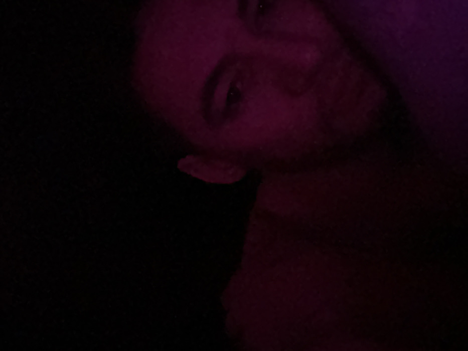 A dimly lit, close-up shot reveals a person's face angled downwards. The lighting casts a reddish-purple hue, obscuring details but highlighting features like an eye, ear, and part of the nose. The background is a stark black, creating a strong contrast. The individual's upper chest is also visible, suggesting a bare-chested or partially clothed state. The image has a dark and mysterious tone.