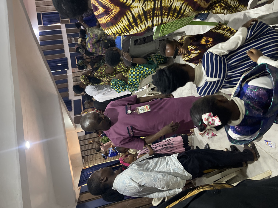 The image depicts an indoor gathering in Kufena, Nigeria, with a diverse group of adults and children