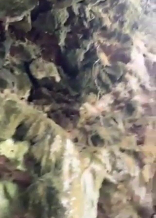 cave structure with large rocks and stalactite-like formations. The rocks are covered in green moss and the formations hang from the ceiling. The camera pans upwards, revealing the exterior of the cave structure where trees and other vegetation are visible. A person wearing a white shirt and dark shorts is standing on a paved path near the base of the structure. A wooden fence can be seen in the background.