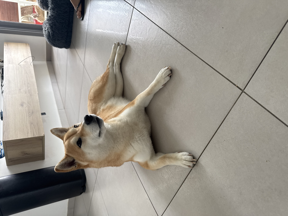 - "A fawn and white Shiba Inu dog lies on a light grey tiled floor with dark grout lines, its body stretched out with front paws extended" by FM-Eqgh52, licensed under CC BY 4.0
