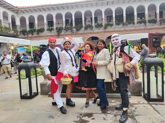 This image depicts five individuals posing in a paved courtyard of a colonial-era building in Cuzco, Peru