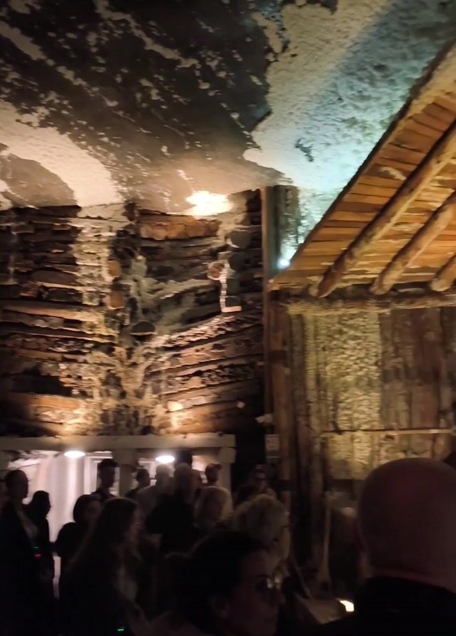 group of people inside a room that looks like a mine shaft. The walls and ceiling are covered with a white, textured substance, likely salt. The room is dimly lit, with visible wooden support beams. There is a structure that looks like a stable with a model horse inside. People are standing around, appearing to be on a guided tour, as a person in the foreground may be speaking. The overall atmosphere is dark and historical.
