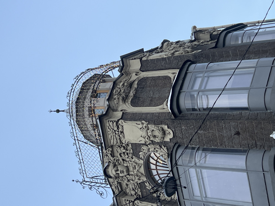 The image displays the upper corner of the Lischke House (Dom Lishke), an Art Nouveau building situated at Bolshaya Konyushennaya Street 29, Saint Petersburg, Russia