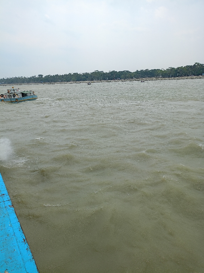 view from a boat, looking out onto the water. The water is choppy with small waves. A single boat, blue with yellow trim, is visible in the distance, moving away from the camera. The shore line is visible in the distance, characterized by a line of trees and what appears to be a man-made breakwater. The sky is cloudy and overcast. The location is a river or estuary in Harni, Bangladesh, located at latitude 22.865, longitude 90.613.