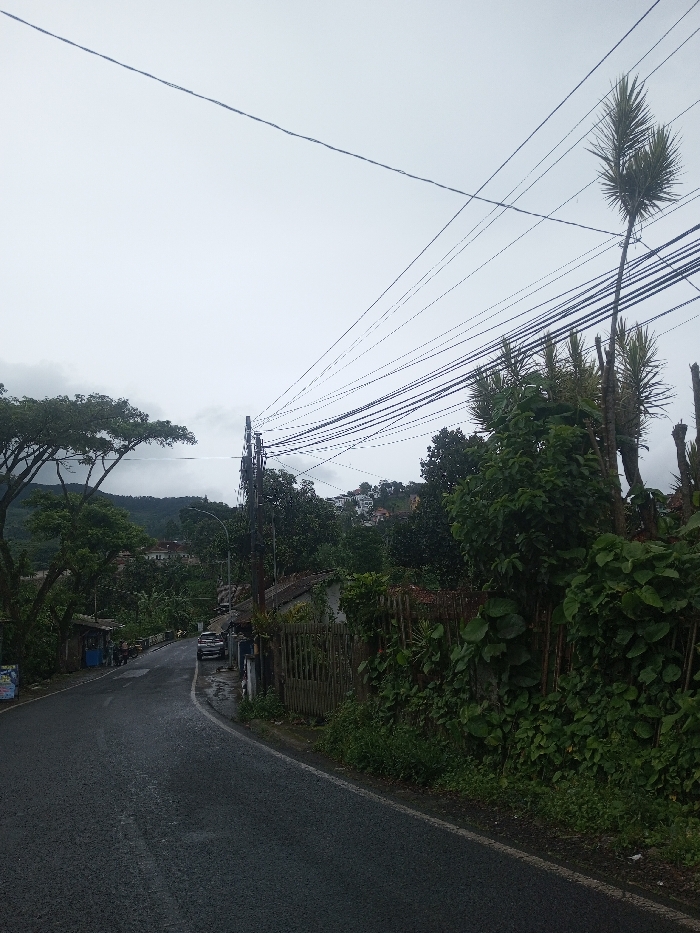 A wet asphalt road curves left, lined by lush green vegetation on the right and trees on the left. A wooden fence partially obscures houses beyond the foliage. Utility poles and a web of wires crisscross the overcast sky. Distant buildings are visible on a hillside in the background. A car is parked on the side of the road. The scene appears to be a residential area in a hilly or mountainous region, likely after or during rainfall.