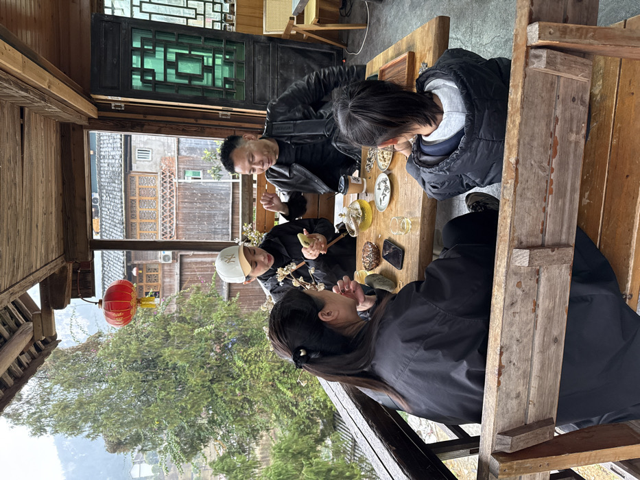 - "The scene depicts four individuals seated around a rustic wooden table on a covered veranda overlooking a traditional town in Gongtan, China" by FM-jql2J3, licensed under CC BY 4.0