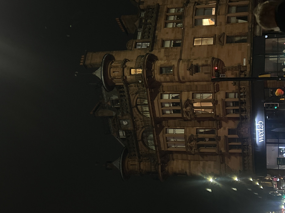 A nighttime view showcases an ornate, vintage building with rounded turrets and intricate stonework. Windows, some illuminated, punctuate the façade. Adjacent to the building is a modern storefront with the word "wed2b" vertically displayed. Streetlights cast a warm glow on the scene, while a dark sky provides a stark contrast. The image is rotated to the side.