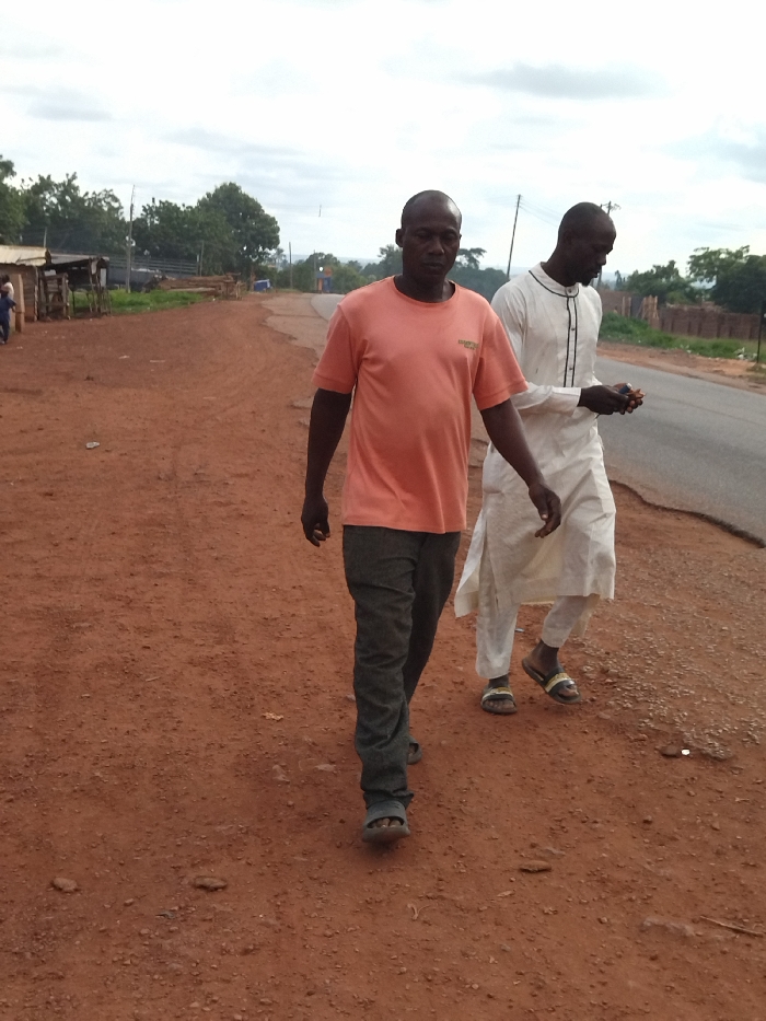 Two men are walking on a dirt road in Tuaniako, Nigeria (latitude: 7
