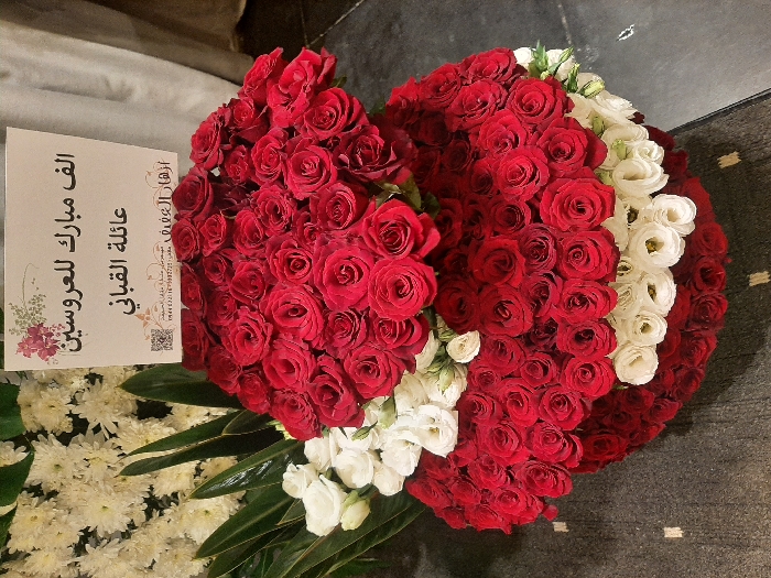 A large, two-tiered floral arrangement is positioned indoors within Al-Midan Municipality, Syria. The arrangement is predominantly composed of tightly packed red roses, forming the bulk of both tiers. White Eustoma or Lisianthus flowers are integrated into the design, appearing in a prominent cluster on the upper tier's left side and as a distinct band encircling the lower tier's base. Dark green foliage is visible behind the upper tier and to the left. A white rectangular greeting card is centrally placed at the top of the arrangement, displaying Arabic text that translates to "A thousand congratulations to the newlyweds" from "Al-Qabbani Family," along with details for "Bride's Flowers" (أزهار العروس), a QR code, and a phone number (0944432167) referencing "Mughber entrance of the mosque." In the background, additional white chrysanthemum-like flowers are visible, suggesting a larger floral display. The arrangement rests on a dark grey carpeted floor with subtle lighter patterns.