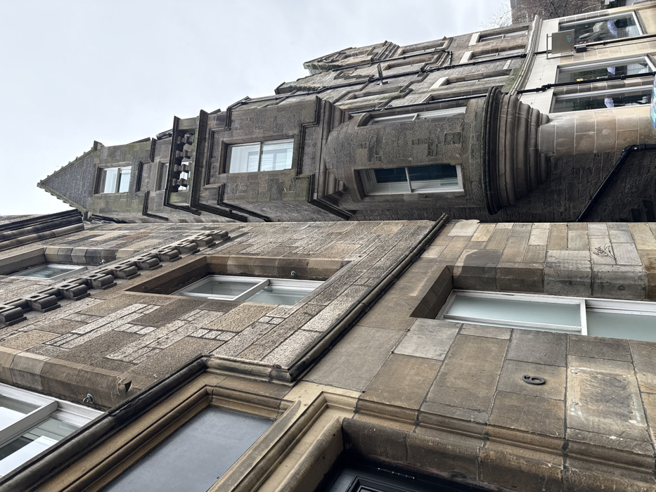 This image depicts an urban street scene in the City of Edinburgh, United Kingdom, under an overcast sky. Two multi-story stone buildings dominate the frame. The building on the left, closer to the foreground, features a facade constructed from grey sandstone blocks arranged in an alternating smooth and textured pattern, with pronounced window sills and decorative elements above some windows. A large dark-framed window is visible, and a dark entrance door frame is partially shown on the far left. The house number "6" is affixed to the stone wall. The adjacent building on the right, also constructed of grey stone, features a prominent, multi-tiered corner bay window structure. This structure originates from a rounded base at street level, ascending into an octagonal section containing multiple sash windows. Above this section, a balustraded balcony is visible, topped by a gabled, turret-like extension with an additional window at its peak. The ground floor of this building houses a commercial establishment, identifiable by its large glass display windows that reflect several white, dome-shaped objects, possibly umbrellas. A small, dark rectangular sign with unreadable white text is affixed near the shop entrance. A dark stone staircase descends between the two buildings, partially visible in the lower right. No individuals, explicit actions, or direct interactions are discernible within the scene.