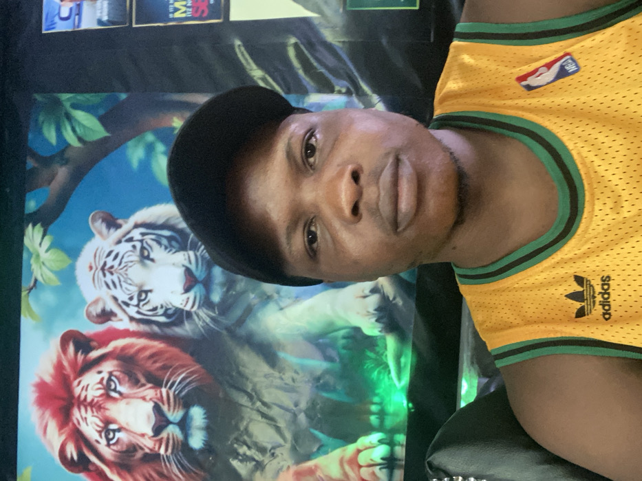 An adult male, appearing to be of African descent, is depicted from the chest up, looking directly at the camera with a neutral expression