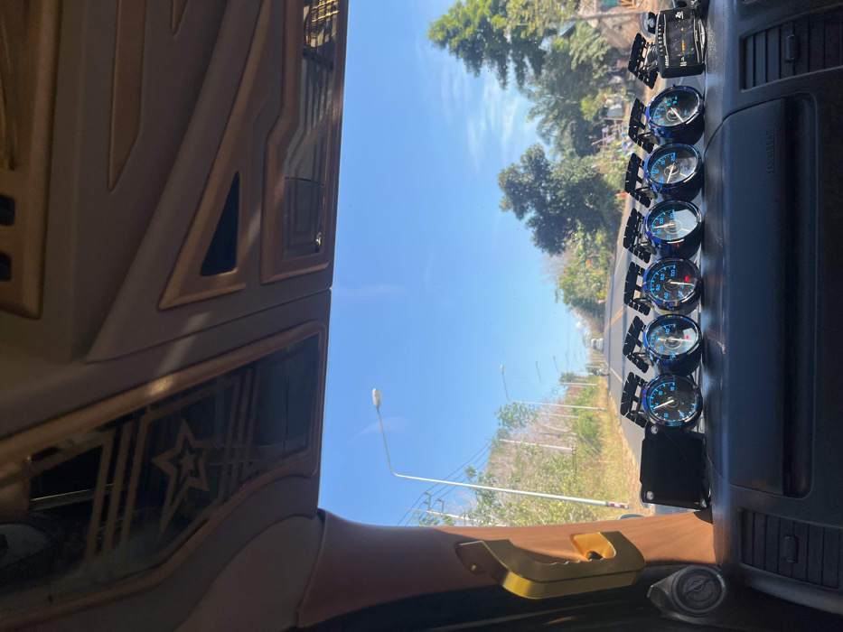 From inside a vehicle, a sunny roadside scene is viewed through the windshield. The dashboard is cluttered with aftermarket gauges, arranged vertically in a stack of six. The interior features ornate wooden paneling with geometric and star designs. Streetlights line the road, and trees are visible in the background under a clear blue sky.