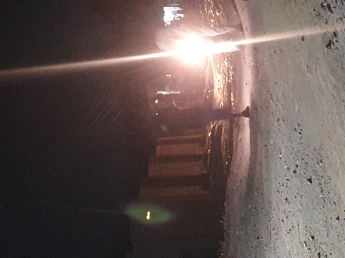 Illuminated stairs ascend into a dark space, adjacent to a textured wall. A bright light source, positioned above and slightly to the left, casts a strong glare across the scene. The steps appear to be made of wood. The rough wall surface features granular details. The left side is dominated by darkness, hinting at a vast, undefined area.