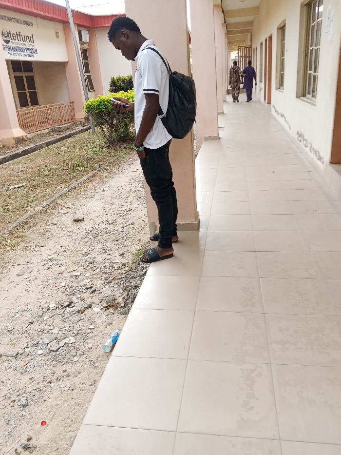 A young, dark-skinned male stands in profile on a cream-tiled covered walkway, facing left and engrossed with a smartphone held in both hands. He wears a white polo shirt, black skinny jeans, black slides, and a black backpack. A light blue wristband is visible on his left wrist. To his left, an untiled dirt ground with sparse dry grass and minor debris, including a white plastic bottle, borders the walkway. In the background, a light-colored building with reddish-brown trim features a visible sign displaying "TETFUND," "TERTIARY EDUCATION TRUST FUND," and "PROJECT: 2013-2015," indicating an educational institution in Lokoja, Nigeria. Further down the covered corridor to the right, two additional individuals in traditional attire walk away from the camera.