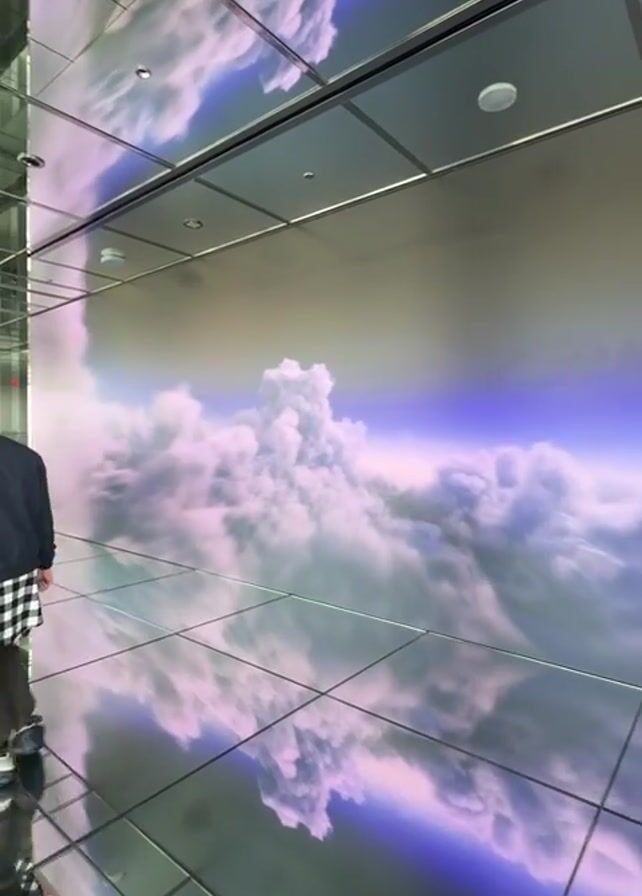 interior of a building with mirrored walls, ceiling, and floor, creating an infinite reflection effect. The floor and walls are divided into square panels. An animated image of white and purple clouds on a blue sky is displayed on the walls, which reflects on the mirrored surfaces, contributing to the immersive experience. A person with short dark hair wearing a dark jacket over a black and white plaid shirt and brown pants walks across the floor. Their reflection appears on the floor beneath them and extends to the mirrored walls. Exit signs are visible on the walls. The lighting in the space is bright and even.