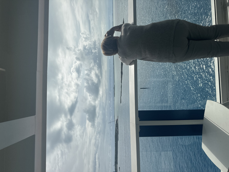 From a balcony on a vessel, a person, seen from the back, observes the Berry Islands seascape in the Bahamas. The individual wears a light-colored long-sleeved top and dark trousers, leaning forward with forearms resting on a white-topped railing composed of clear panels and dark blue vertical supports. The person's hands are near their head, possibly holding an object to view the distance. The body of water is a vibrant blue, reflecting sunlight in various patches. In the middle ground, several dark, slender markers protrude from the water. The horizon features distant landmasses, one of which displays a prominent construction crane. The sky is overcast with numerous grey and white clouds. A white table is partially visible in the lower left foreground. Above, a white ceiling structure with parallel grey stripes is present.