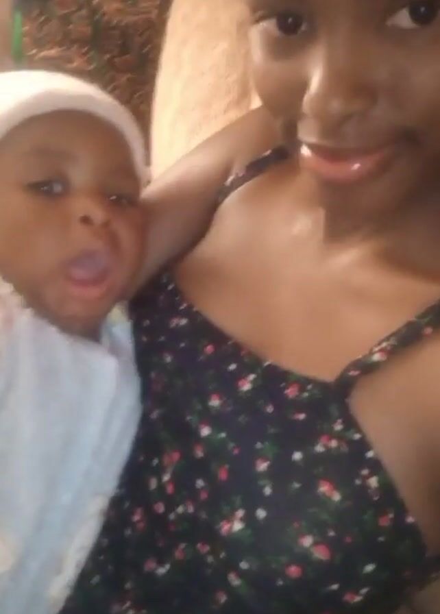 A woman wearing a yellow head wrap and a black floral print dress is holding a baby wearing a white hat and a blue onesie. The baby opens its mouth. The woman smiles. The background is blurry and appears to be an interior room.