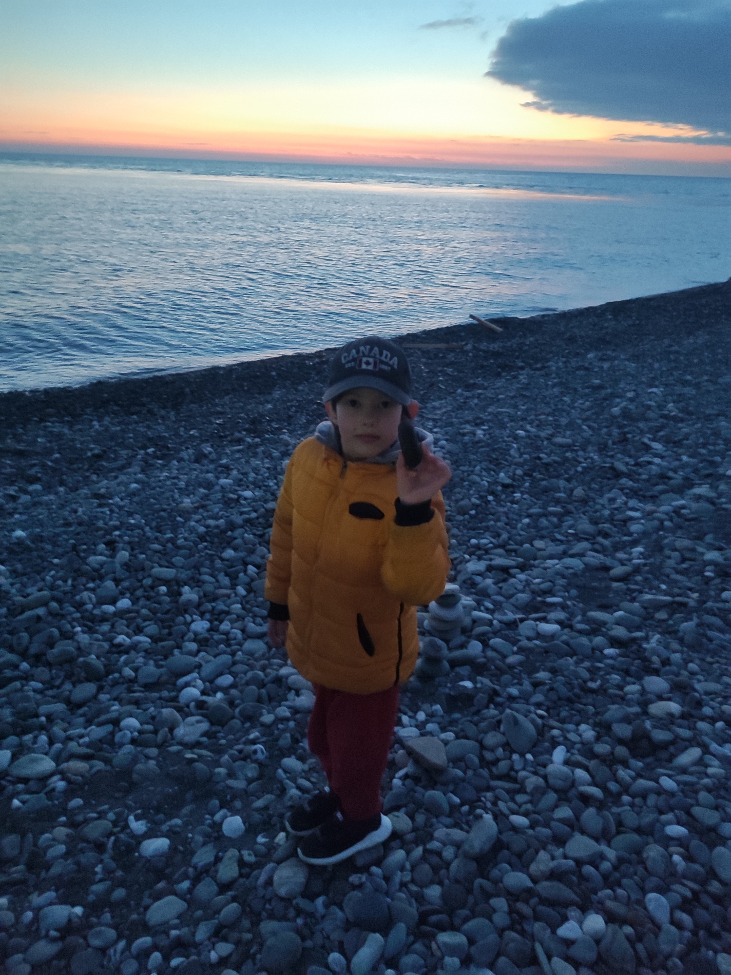 A young boy stands on a pebble beach, holding a dark-colored stone in his right hand. He wears a yellow puffy jacket, red pants, and black sneakers, and a dark baseball cap with "CANADA" embroidered on it. The background shows a body of water meeting the horizon, with a colorful sunset above. The scene is illuminated by the dusk sky. No specific city details are apparent to determine the exact location in Sirius, Russia.