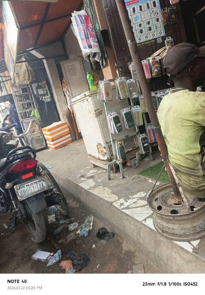 A cluttered urban scene shows a motorcycle parked near a concrete curb strewn with trash. The license plate reads "RB057-TAK". A weathered refrigerator displays hanging phone cases. A man in a cap and yellow shirt sits nearby, partially obscured by a metal pole and wheel rim. Above him, advertisements and goods hang from a stall. The ground is dirty and worn, adding to the overall disheveled atmosphere.