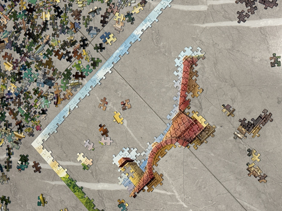 - "A partly assembled jigsaw puzzle sits on a gray, veined surface, likely tile or linoleum" by FM-AtE073, licensed under CC BY 4.0