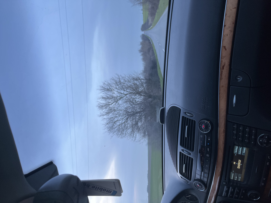 The image presents a forward-facing view from the interior of a vehicle on a rural road within the general vicinity of Sredets, Bulgaria. The car's dark grey dashboard, featuring central air vents, climate controls with a display showing "24" degrees Celsius and an "Auto" setting, and an infotainment system displaying "ENERGY" on its screen, occupies the lower half of the frame. A wood-grain trim accents the lower dashboard. A white, rectangular air freshener labeled "mobile.bg" hangs from the rearview mirror in the upper left. Outside the windshield, a paved, two-lane road, appearing damp, stretches straight into the distance, disappearing over a slight rise. The sky is overcast with light blue-grey clouds, and two parallel power lines are visible across the upper portion of the sky. Green fields are visible to the left of the road in the foreground. Bare, deciduous trees and dense bushes line both sides of the road, with a large, prominent bare tree situated in the mid-ground to the left of the road. No individuals or other vehicles are distinctly visible.