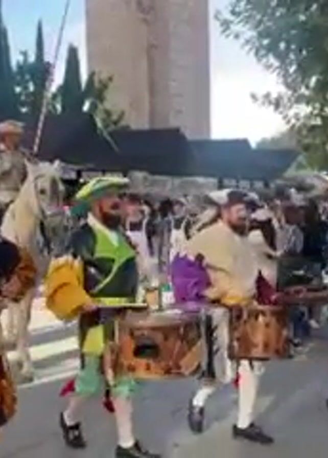 A group of costumed performers parade in a public square. Four men wearing colorful Renaissance-style clothing march while playing hand-held drums. Behind them, a person in full medieval armor rides a white horse. The group parades through a crowd of onlookers on a sunny day. Trees and a tall brick structure can be seen in the background, along with vendor stalls.
