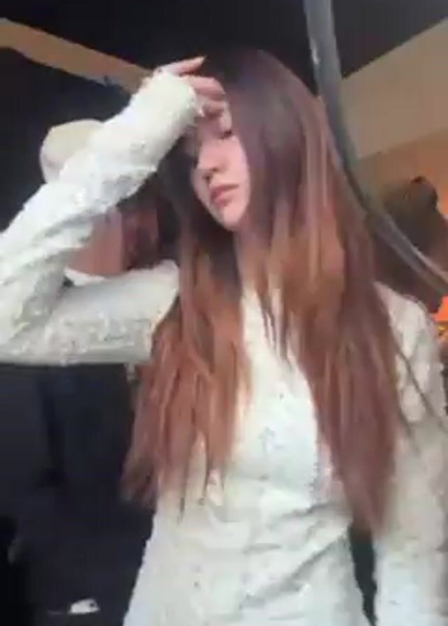 A woman with long brown hair, wearing a white, high-necked, long-sleeved dress, stands in a room that appears to be a studio or backstage area. She gestures with her hands at the beginning of the video, then poses with her hand on her head and looks at the camera. Other people are visible in the background, including a man wearing glasses and a baseball cap, and another person behind him. The lighting is warm and slightly dim.