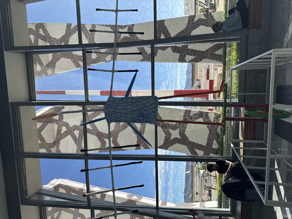 This image depicts the interior of a modern airport terminal at Fes-Saïs Airport (FEZ) near Ouled Tayeb, Morocco, overlooking an active tarmac on a clear day. In the mid-ground, a large, stylized sculpture of a bird-like figure dominates the central view, composed of a blue, scaled body, long red legs, and a unicycle-like base with a green wheel. The sculpture stands directly in front of expansive floor-to-ceiling windows. These windows feature vertical panes, some adorned with translucent white and brown geometric patterns reminiscent of Moroccan mosaic designs, while others offer unobstructed views. Through the windows, a blue sky with sparse clouds is visible above a flat tarmac area. Key exterior elements include a tall, red and white striped tower-like structure centrally located in the background, segments of parked aircraft (including a white fuselage and a tail fin), a white airport service bus, and a raised red and white striped platform or walkway. Distant mountains frame the horizon. Several small figures, likely airport personnel, are visible on the tarmac. In the foreground, to the left, a male subject with short dark hair, wearing a dark shirt, is seated on a light wood bench. He is looking down at a small electronic device held in his hands. A dark backpack rests next to him on the bench. To the far left, a partial view of another individual, possibly holding a phone or camera, is visible. To the right, a female subject, wearing a light-colored denim jacket, is seated on a similar wood bench, facing left. White metal railings separate the foreground seating area from the central space occupied by the sculpture. Green plant beds are visible along the base of the windows.