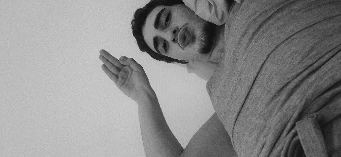 A grayscale, upward-angled shot shows a man with dark hair and a beard. His lips are pursed in a kiss expression. He wears a draped gray shirt. His left arm is extended, with fingers splayed apart. The background appears to be a blank wall, subtly textured. The photograph is simply lit, with soft shadowing.