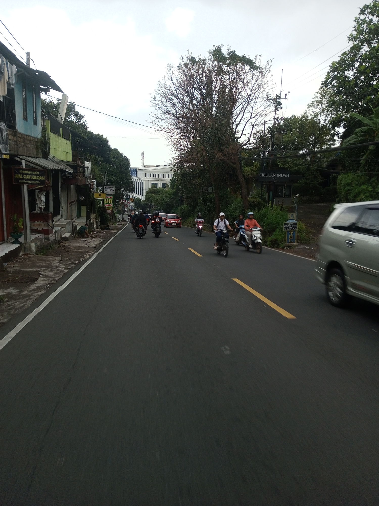The image captures a street in Ciherang, Indonesia, displaying a mix of residential and commercial structures. The asphalt road shows a yellow center line and a white edge line on the left side. Multiple motorcycles are traveling on the road, as well as a silver van on the right side. On the left side of the road, there are older buildings with visible signs like "JUAL CAT KILOAN" (selling paint by weight) and "PALL INN." Across the road, signs for "CIBULAN INDAH Hotel" are seen, partially obscured by foliage. In the background, a white building with a distinctive architectural style is visible. Power lines are overhead, and there is sparse tree cover on both sides of the road. The sky is overcast.