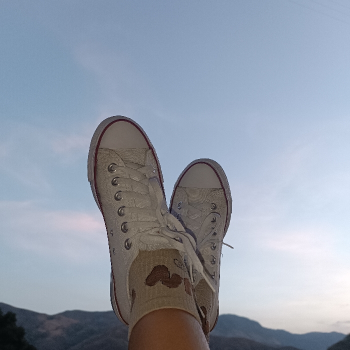 - "A pair of human feet, clad in white canvas low-top sneakers with white laces, silver eyelets, white rubber toe caps, and red-striped white soles, are elevated against a scenic backdrop in Trapiche del Medio, Venezuela" by FM-mV6Ik2, licensed under CC BY 4.0