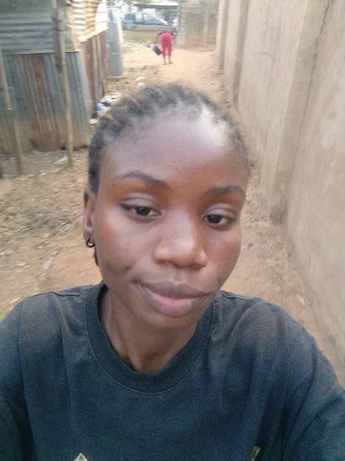 A woman with braided hair, hoop earrings, and a dark crewneck shirt poses for a selfie in an outdoor setting. Behind her are buildings with corrugated metal walls and a tall wall. In the distance, a person in red clothing walks away from the camera, and a car is visible. The ground appears to be dirt.