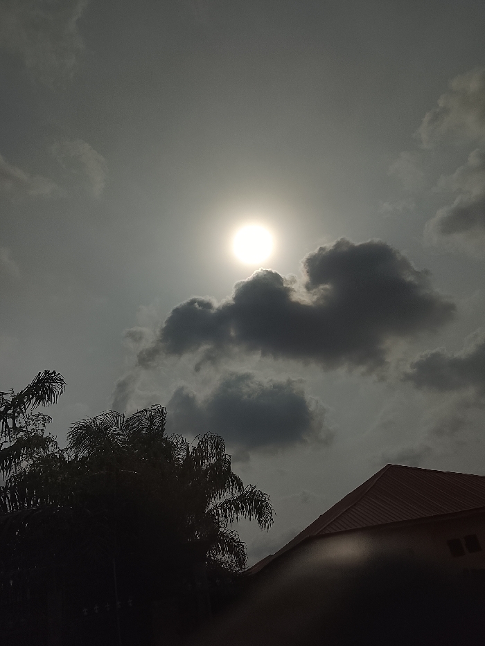The image depicts an outdoor scene in Lafia, Nigeria, characterized by an overcast sky. The sun is visible as a bright, circular light source positioned centrally in the upper half of the frame, partially obscured by and illuminating surrounding clouds. Multiple dark grey clouds are distributed across the sky, with lighter grey areas indicating diffused sunlight. In the lower-left quadrant, dense, dark green foliage, consistent with palm trees, is visible, silhouetted against the sky. In the lower-right quadrant, the upper section of a building is present, featuring a steeply pitched roof clad in reddish-brown corrugated metal. A light-colored wall section with two rectangular window openings is partially visible beneath the roofline. No individuals, explicit actions, or interactions are discernible.