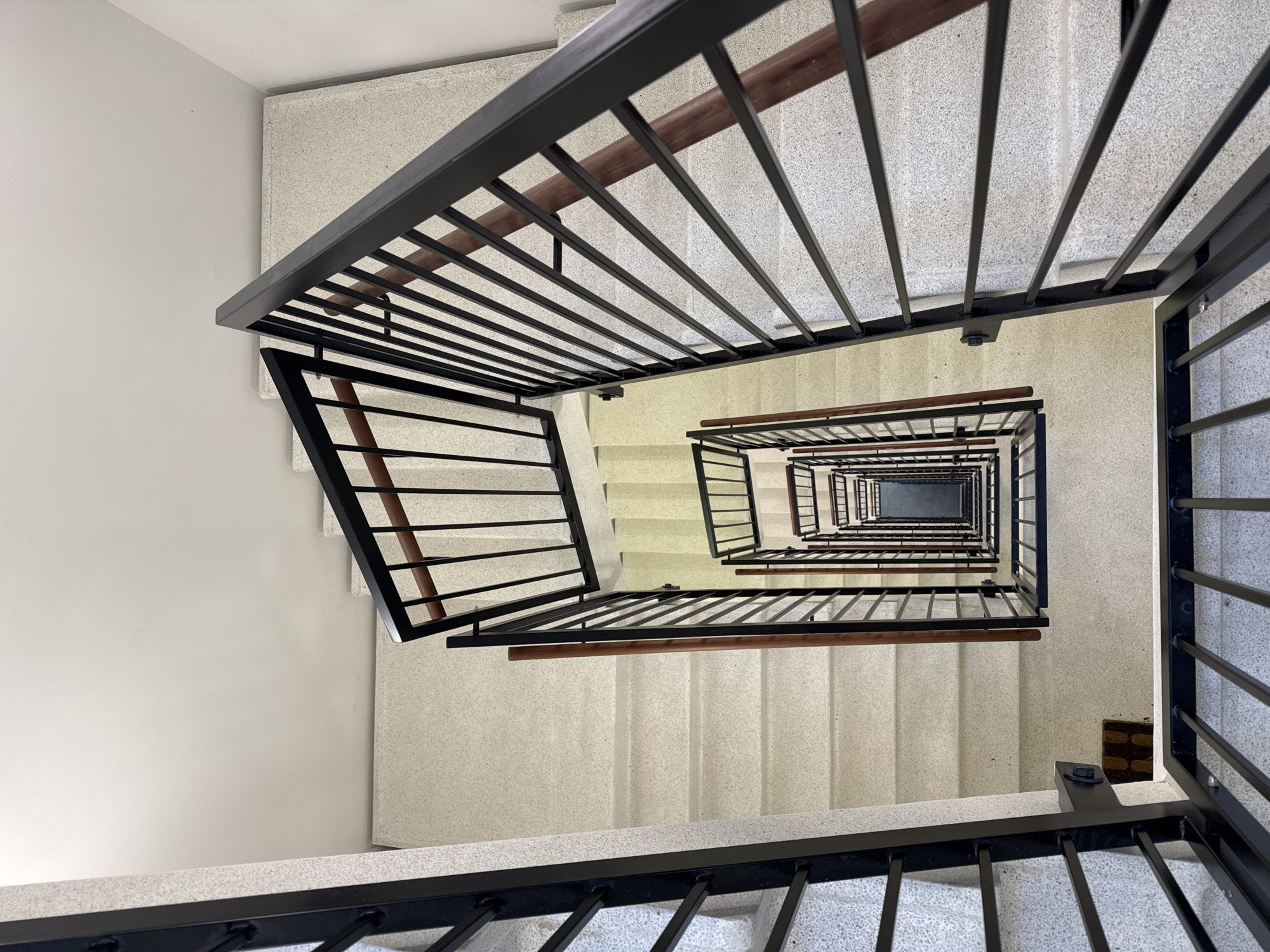 This image depicts a high-angle view looking down into a multi-story, open-well staircase, located within the Porthuset residential complex near Fælledparken, Copenhagen, Denmark. The stairwell consists of light beige-grey speckled terrazzo steps and landings, bordered by plain white walls. Black matte-finished metal railings, featuring vertical balusters and horizontal top rails, are capped with dark reddish-brown wooden handrails. This creates a geometrically repeating spiral pattern extending several floors downwards. The visible depth decreases in clarity, with the lowest sections appearing darker and subtly tinged yellow-green. On a landing approximately two floors below the camera's perspective, a small, dark brown, textured doormat is visible on the left side. No individuals or active subjects are present in the scene.