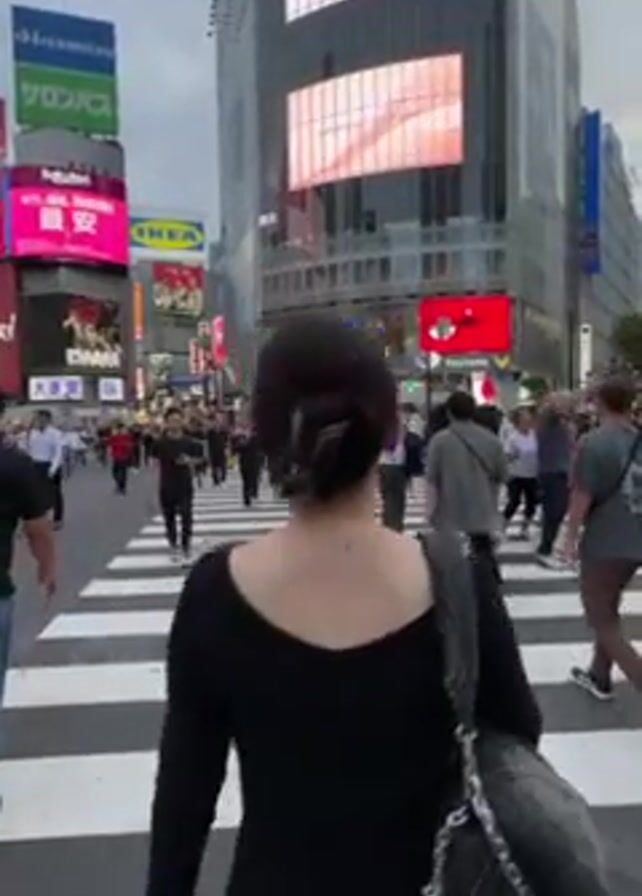 crowded pedestrian crossing in an urban environment, likely in Japan. Several people, mostly adults, are crossing a wide street marked with zebra stripes. They are walking in different directions. Several large billboards surround the intersection displaying various advertisements, including those for "PERFECT DIARY", "Starbucks", and "IKEA." The sky is overcast.