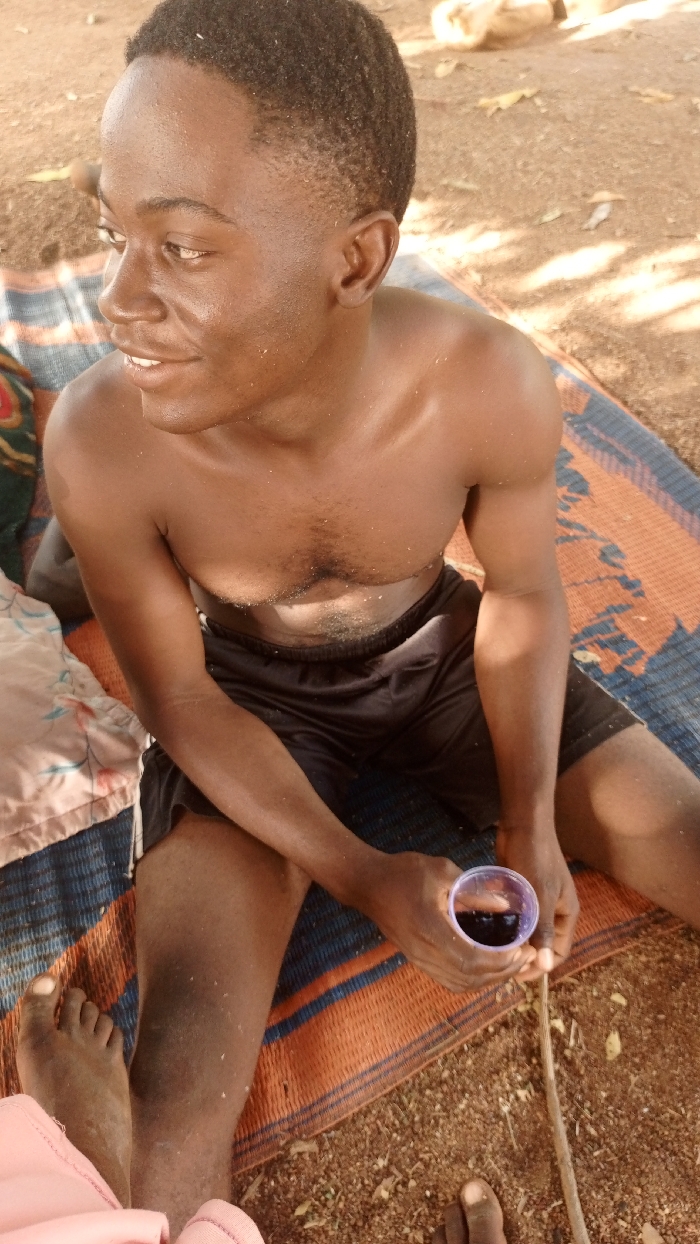 A shirtless, dark-skinned man sits cross-legged on a woven mat. He wears black shorts and holds a small, clear plastic cup filled with a dark liquid. The man gazes off to the side with a slight smile. Another person's foot is visible in the lower left corner, and a slender stick lies on the ground near the man's hand. Dust or sand appears to be scattered on his skin and the mat.