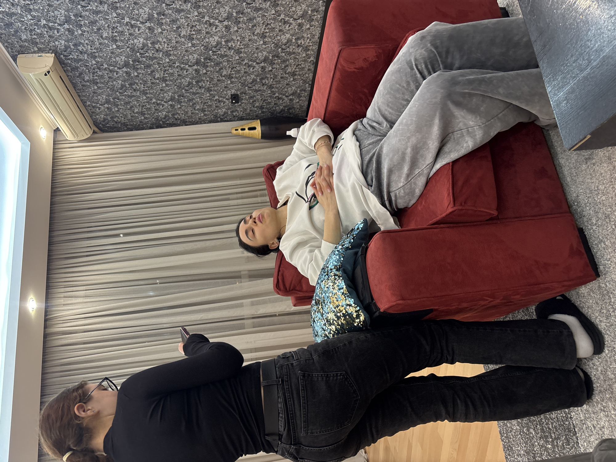 The scene depicts the interior of a residence in Tbilisi, Georgia. A woman is reclining on a red upholstered couch, dressed in a white sweatshirt and gray sweatpants. A second individual, wearing black jeans and a black top, is partially visible near the bottom of the frame, holding a mobile phone. The room features textured wallpaper, a window with blinds, and a wall-mounted air conditioner. A blue sequined pillow is present on the couch. A black object (likely a table) is located at the top right corner. One individual wears black slippers.