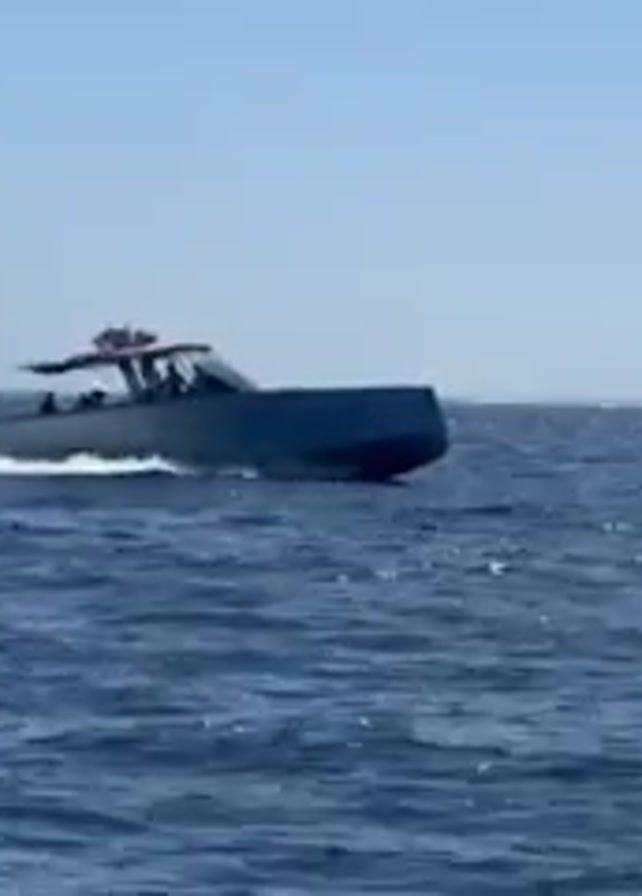 gray motorboat moving across a body of water under a clear, blue sky. The boat is cutting through the water, creating a white wake. Another boat is visible in the distance. The water appears to be a deep blue color.