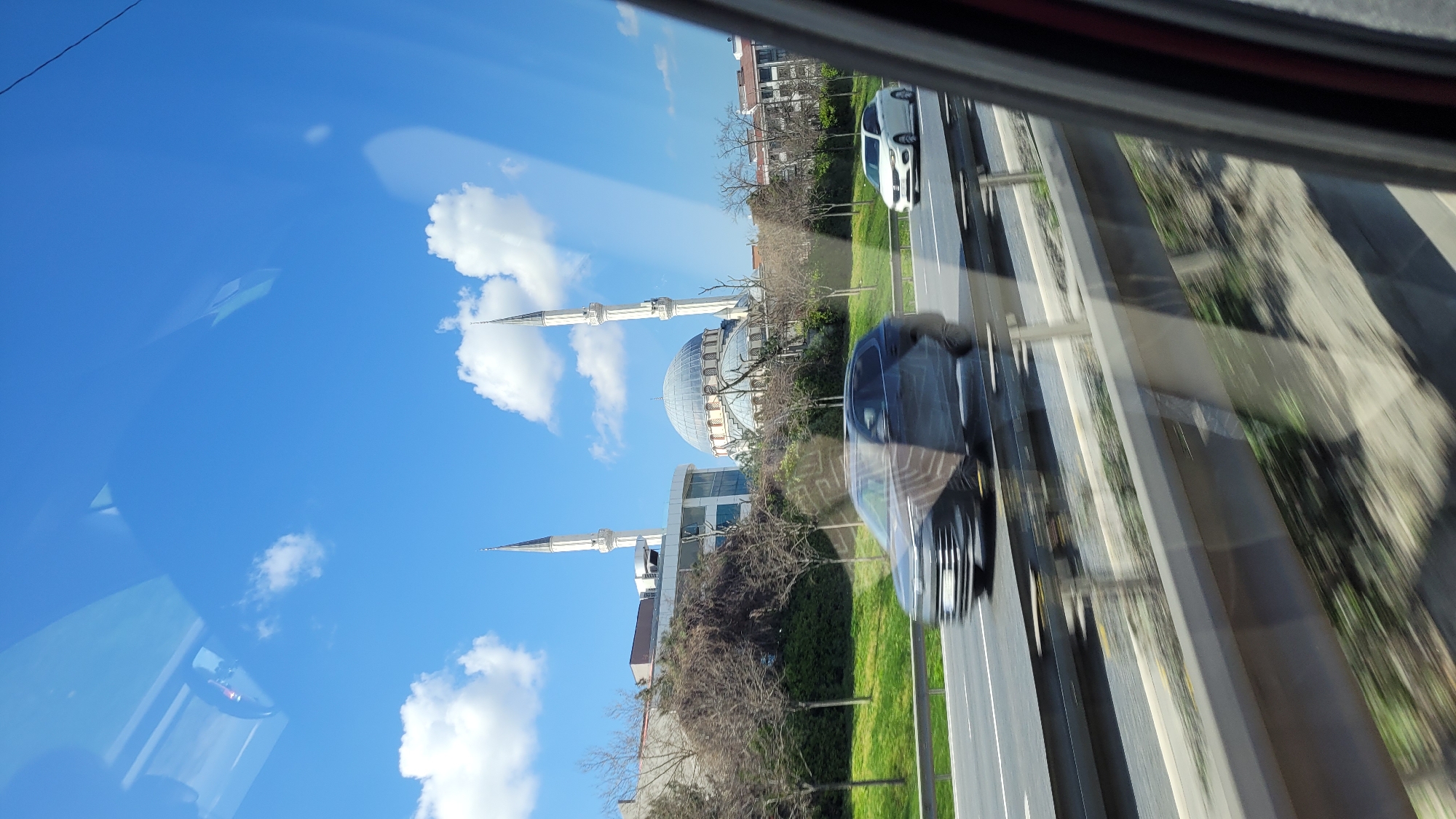 The image, taken from inside a vehicle, shows a street scene in Esenyurt, Turkey. The sky is blue with scattered clouds. A large mosque with a dome and two minarets is visible. Cars are on the road, and green vegetation is present. The image is likely taken through a window, as reflections can be seen.