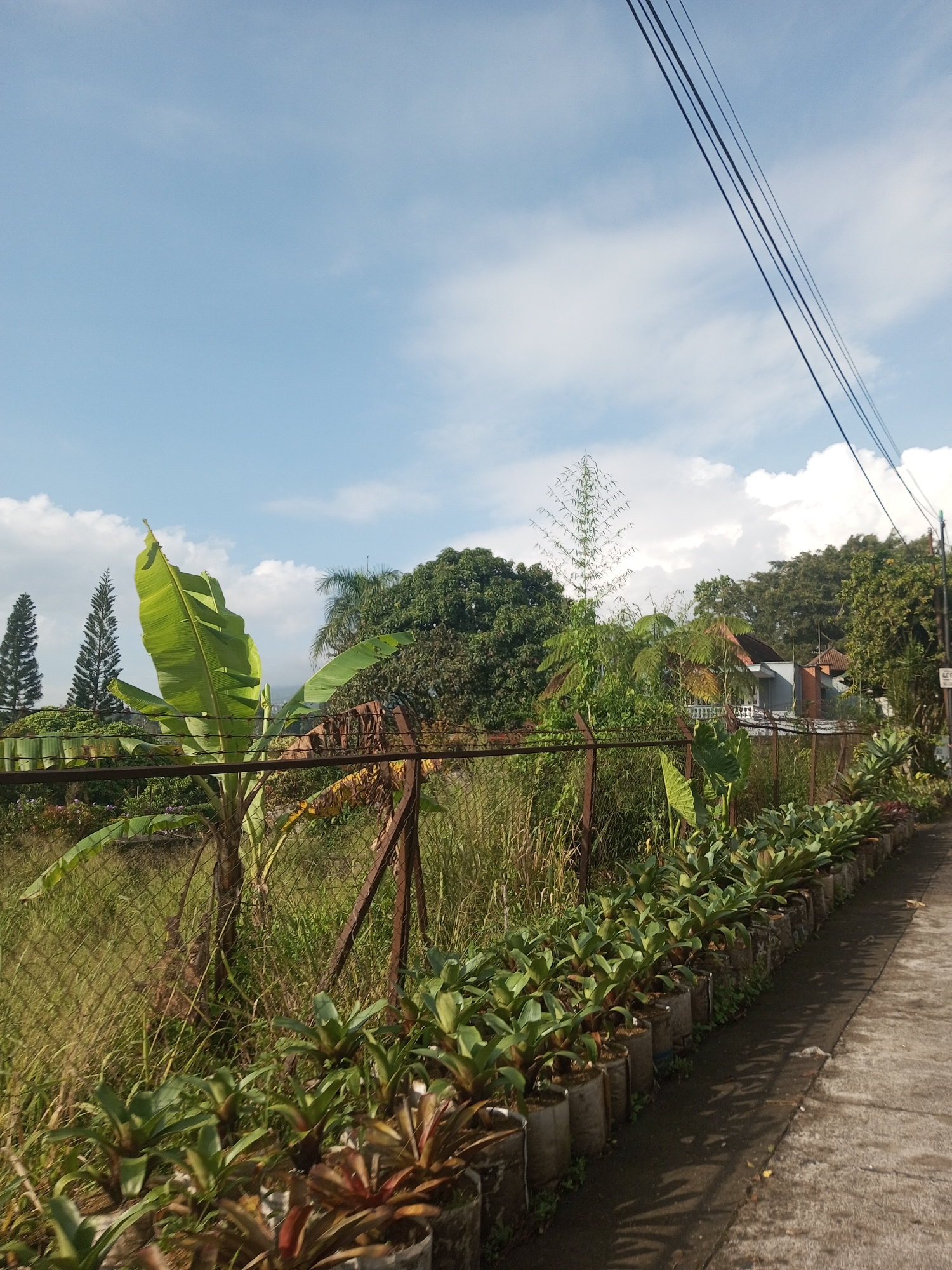 The image depicts a view in Mya Sit Kaing Ywar Thit, Myanmar. A chain-link fence runs along a sidewalk, separating it from an overgrown area. The fence is secured with rusty metal posts. On the sidewalk side, a line of potted plants with green and reddish-brown foliage stretches into the distance. Behind the fence, vegetation grows wild, including banana trees and tall grasses. In the background, several trees are visible, along with a house with a gray roof. Power lines cut across the upper right portion of the frame against a blue sky with scattered clouds.