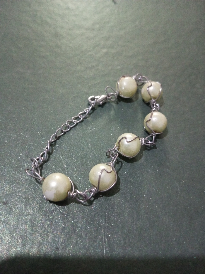 The image displays a bracelet on a dark green surface. The bracelet features six round, off-white pearls individually encased in silver wire loops. These are linked together by the wire, leading to a silver chain with an adjustable clasp. The pearls appear to have a subtle sheen and slight variations in color, suggesting a natural or imitation pearl material. The wire wrapping is somewhat irregular, lending a handmade quality to the bracelet.