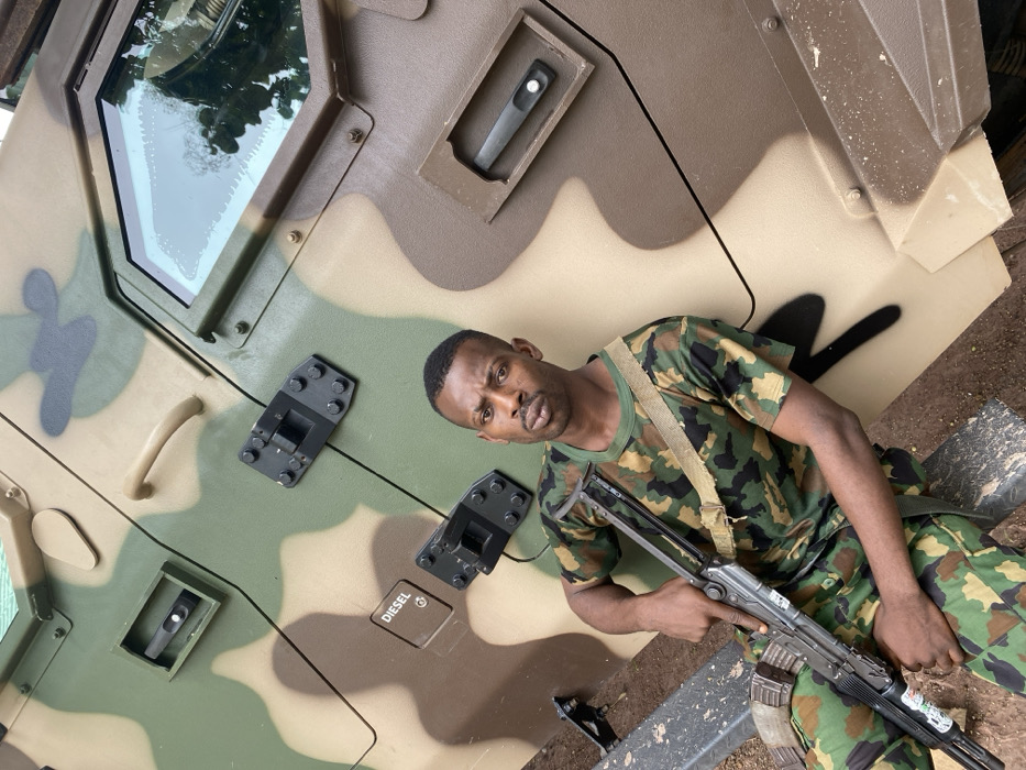 A male individual is depicted in a close-up, angled shot, seated or leaning against a large military vehicle. He has dark skin, short dark hair, and a light beard. He wears a military camouflage uniform with green, brown, and black patterns, an olive green undershirt collar visible, and a tan/olive green strap across his left shoulder. He holds a dark-colored assault rifle with his right hand on the foregrip/magazine area, the buttstock resting on his lap. His expression is neutral as he looks directly at the camera. The background is dominated by the side of a large armored personnel carrier or similar military vehicle, painted in a matching camouflage pattern of brown, green, and black. Visible features on the vehicle include multiple bolted panels, two grab handles (one tan, one dark), and a small, tinted blue window or viewport reflecting green foliage. A "DIESEL" label is visible on a panel. The ground in the lower portion of the image is reddish-brown dirt. The scene is illuminated by natural daylight. The location is Zaki Biyem, Nigeria.