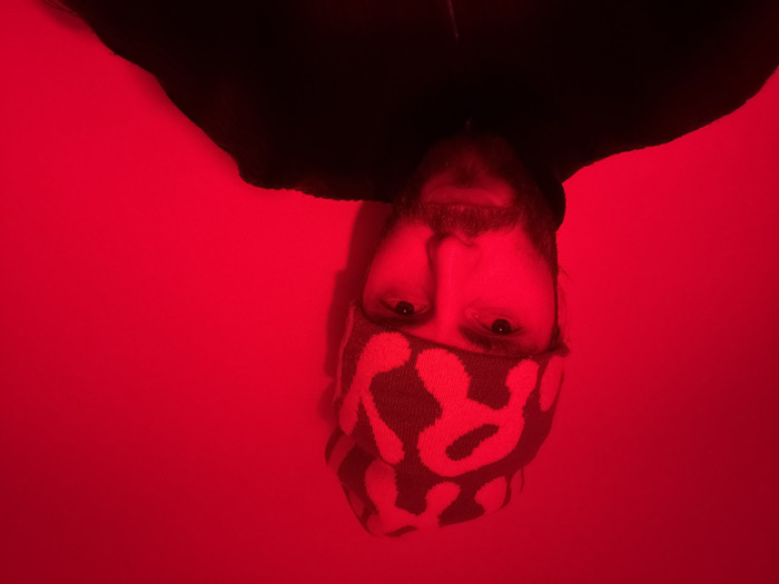 An upside-down image shows a person in a red-lit environment. They wear a dark-colored upper garment, and a knitted balaclava covers the lower half of their face, revealing only their eyes and the top of their beard. The balaclava has a light-colored, spotted pattern. The background and the person are bathed in an intense red light, creating a monochromatic effect.